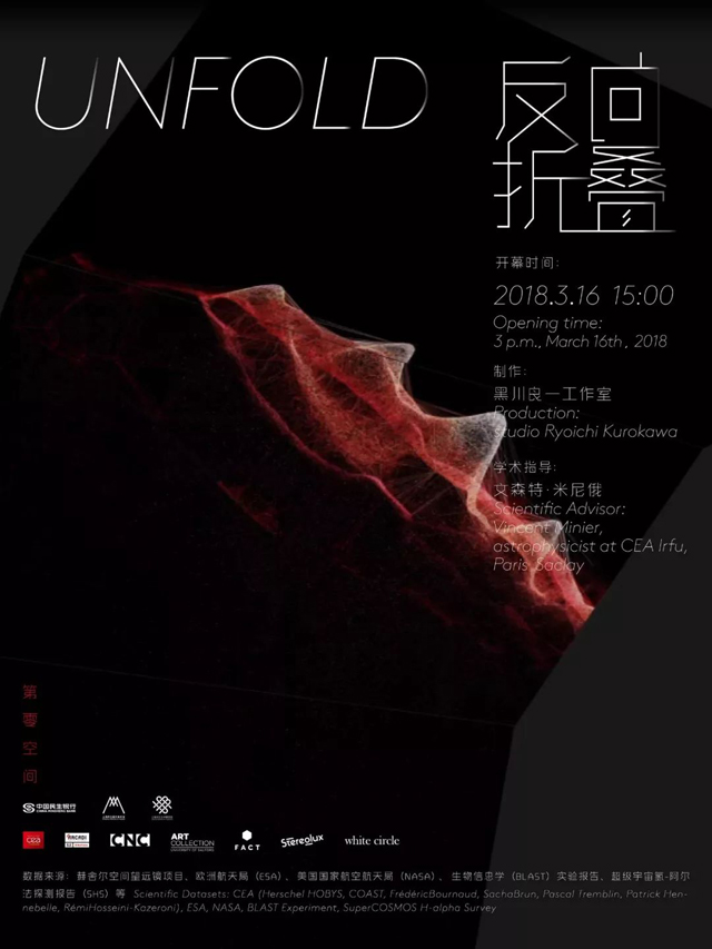 这次黑川良一带来的“反向折叠”是他的一件全新作品,以求将星辰及星系的形成、演化相关的诸多现象转译成声音、图像及振频。 “反向折叠”努力表现核聚变(像太阳那样的恒星的能量来源),为超新星爆炸的最初瞬间建构模型,并最终描绘出不同星系撞击之后重新形成新恒星的过程,这种现象似乎也是我们所在的星系在数十亿年后注定将会遇到的。